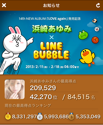 これで、また、LINEバブルの平均点が上がりますね、私の周りの友人も、100万点オーバーが当たり前になって来ています。