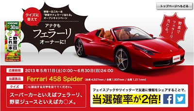 野菜ジュースを飲んで「フェラーリ458スパイダー」をもらおう!