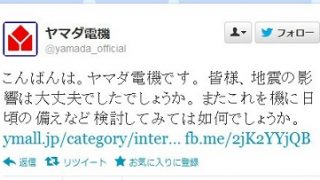 先日の3・11を彷彿させる、大きな地震でやはり「災害は忘れたころにやって来る」と言う事が改めて認識させられました。賛否両論ありそうですが、ヤマダ電機のツイッターが大きな波紋を呼んでいます。上のツイートは、地震直後にヤマダ電機の公式ツイッター...