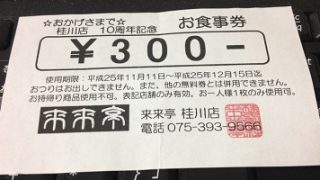 私は、ラーメンの「来来亭」が好きで、よく食べに行きます。私の自宅から近い、「来来亭」の桂川店は、京都の桂川街道沿いにあります。ここの、桂川店では、10周年のイベントが開催されています。来来亭の桂川店は、この2013年11月で10周年を迎える...